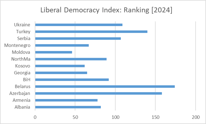 The comparison, in terms of reforms, between the Western Balkan candidate countries and some of the Eastern European countries, with the exceptions of Belarus, Turkey and Azerbaijan, shows very similar results with few major differences. In terms of the liberal democracy index[iii] designed by the V-Dem Institute, the Western Balkans show only slightly better scores than Eastern European countries, with the exception of Serbia. In terms of economic reforms, the Eastern European countries have even performed better than some of their Western Balkan counterparts. This does not discount the fact that performances between these countries may show some large degrees of differences.